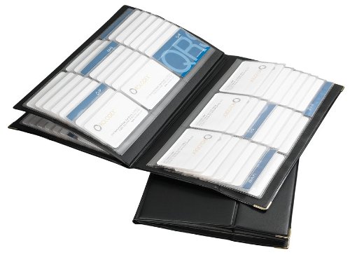 Business card book features dual-fold cover for easy viewing. Durable black vinyl cover with metal-tipped corners stands up to active use. Includes 32 transparent pages to hold a generous total of 192 cards.